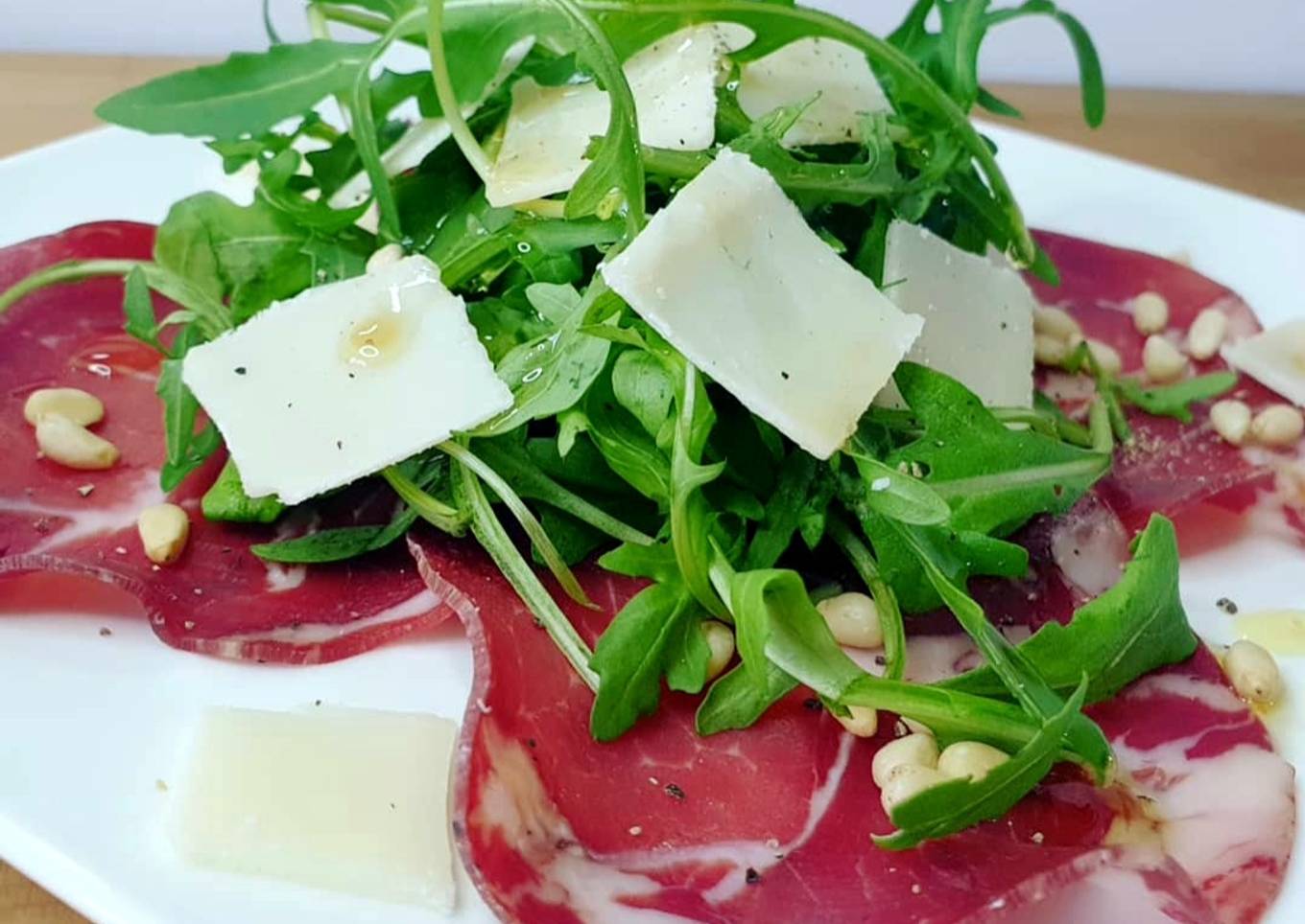 - Au centre, y déposer une belle poignée de roquette. Ajouter les copeaux de parmesan et les pignons de pin.
