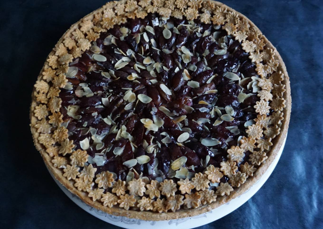 - Dénoyautez les quetsches, coupez-les en 2 et placez-les sur les côtés et en les serrant bien, parsemez des amandes effilées et sur les bords des fleurs décoratives ou autre de pâte.