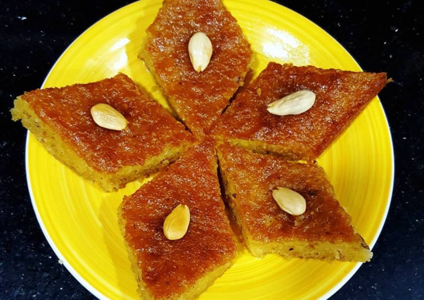- On arrose le gâteau bien froid avec le sirop très chaud et on laisse au frigo pendant 3h ensuite on découpe en losanges et on décore.