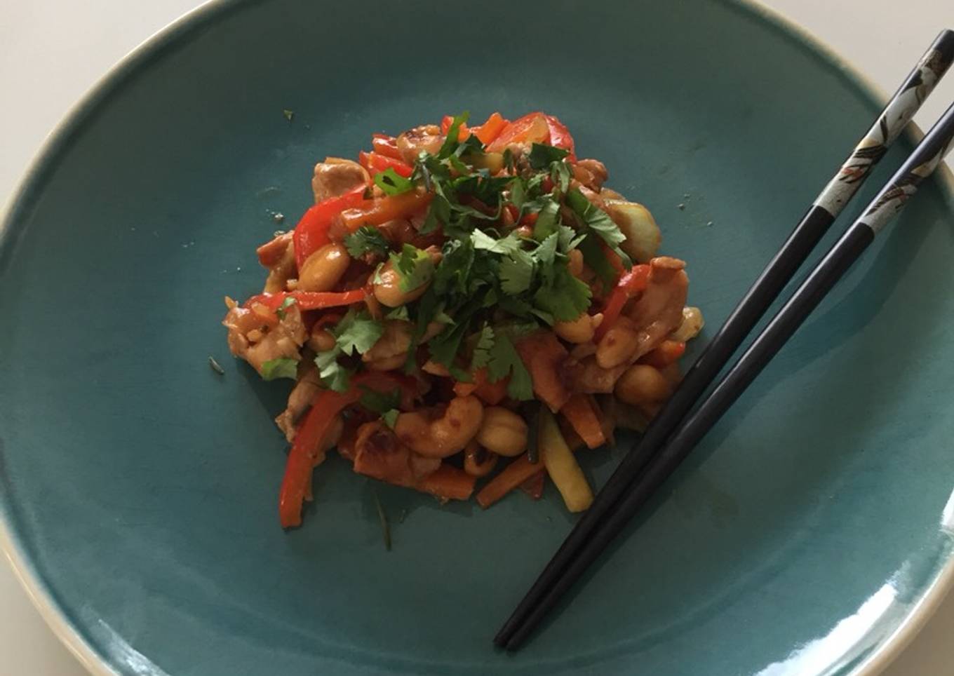 - Détailler le poulet en lanières. Le faire revenir dans un wok à feu vif avec 1 cuillère d’huile. Au bout de 5 mn ajouter les noix de cajou, le miel et 2 cuillères à soupe de sauce soja. Laisser cuire jusqu’à ce que le liquide soit évaporé et le poulet bien caramélisé.
